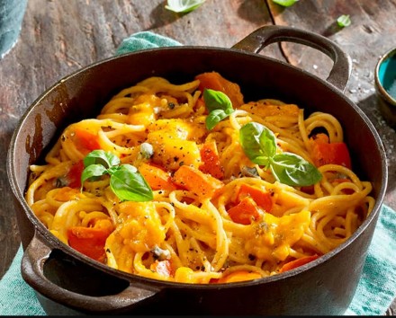 Spaghetti zufügen. Zugedeckt ca. 8 Minuten köcheln lassen.